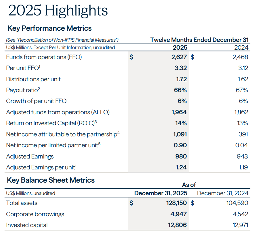 Adicionalmente, en la call del Q4 de hoy, añadió la siguiente información relativa al 2026: “Mirando hacia el 2026, anticipamos un entorno constructivo para el despliegue de capital y la ejecución operativa. Contamos con una cartera de crecimiento orgánico y factores estructurales derivados de la digitalización, descarbonización y desglobalización. Con un balance que refleja una liquidez de $6.000 millones, mantenemos nuestro objetivo de alcanzar un crecimiento del FFO por unidad superior al 10% para 2026”