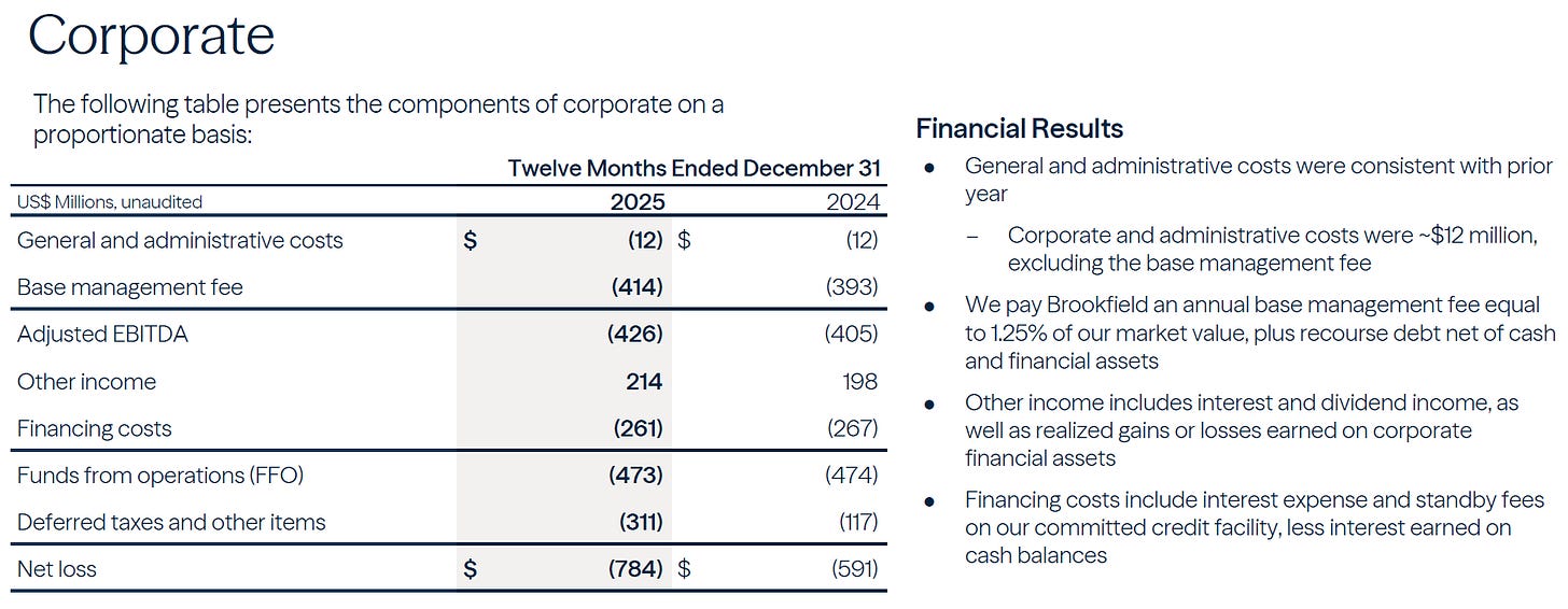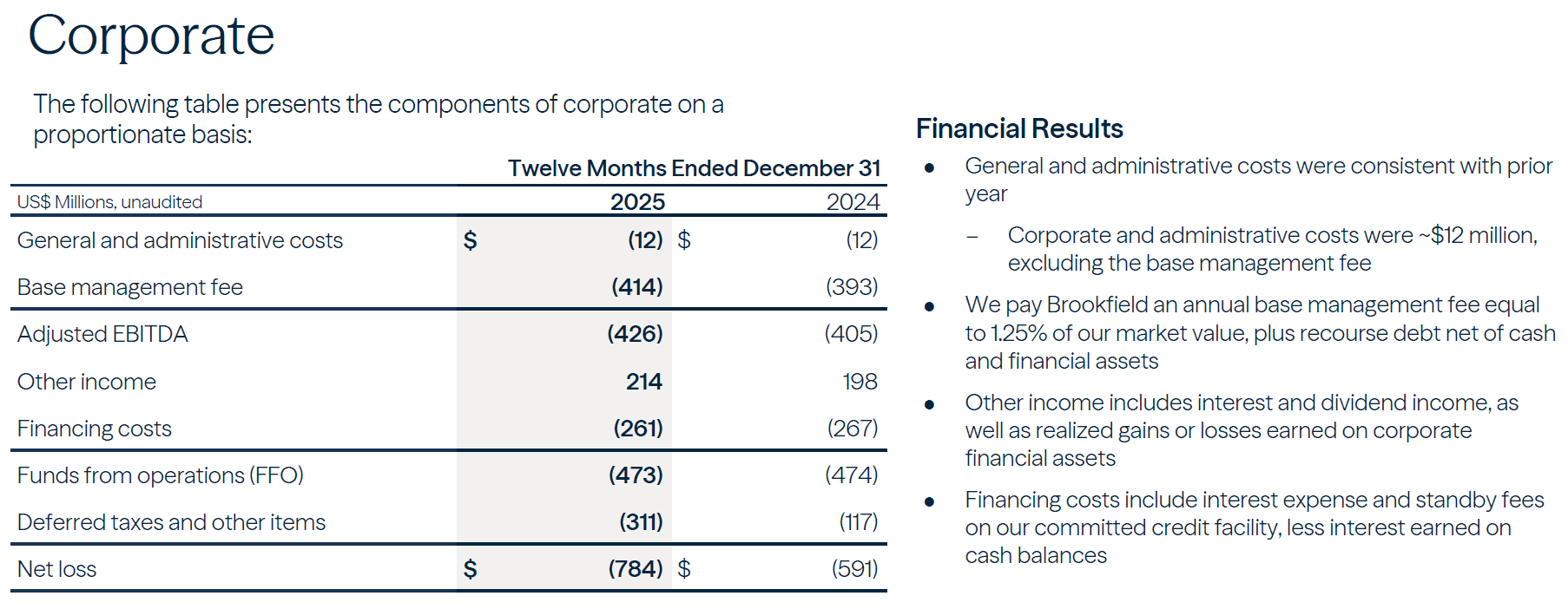 Comisiones de Gestión (Management Fee). BIP paga una tarifa base por la gestión de BAM. Es un 1.25% del valor de mercado de BIP junto a la deuda corporativa neta. Si la acción sube, BAM gana más. A cierre del Q4 2025, estas comisiones de gestión han sido de $414M.