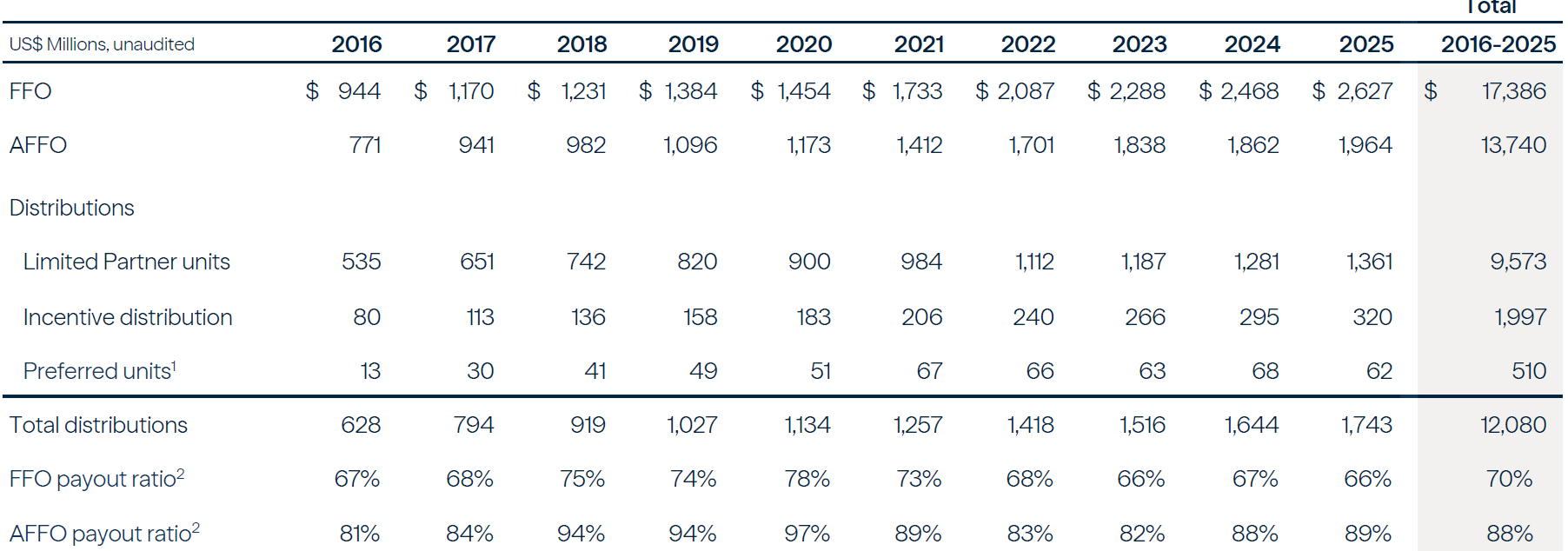 Cómo funciona: de cada dólar extra que BIP sube el dividendo, BAM se queda con el 25%. Debido a esto, BAM ingresó $320M. en el año 2025 por este concepto, una cifra que no para de crecer anualmente (vs. $295M en el 2024).