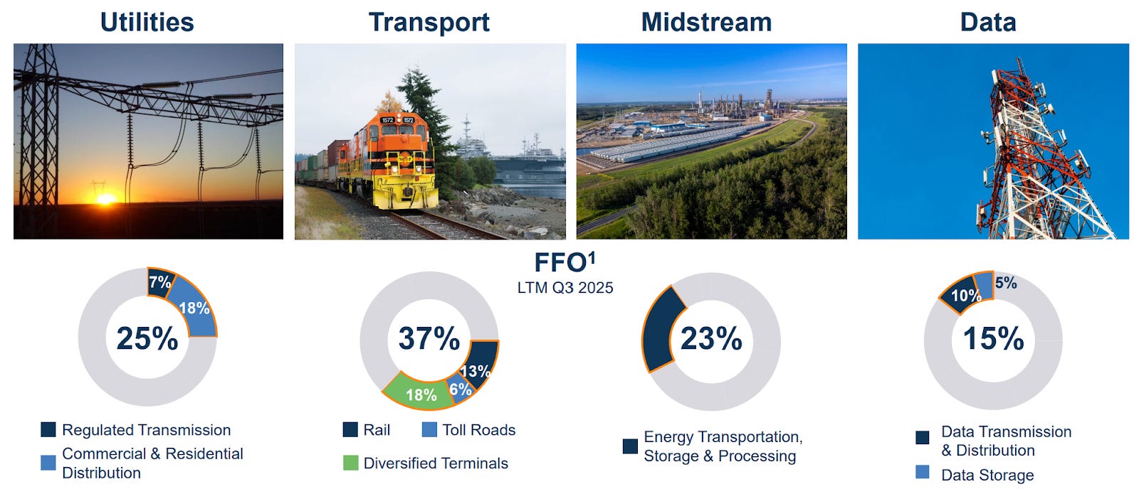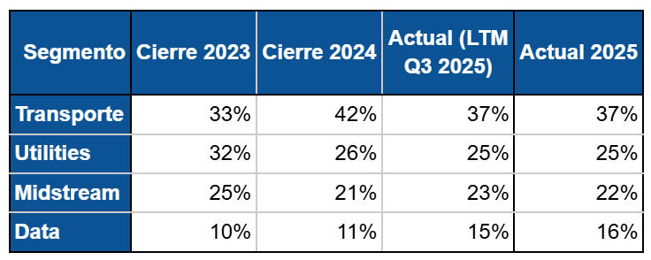 Utilities: Su peso se ha mantenido relativamente estable, pasando del 26% al 25%. Han vendido activos regulados (como los gasoductos en México) para reciclar ese capital, compensando casi totalmente el crecimiento orgánico y las nuevas conexiones.